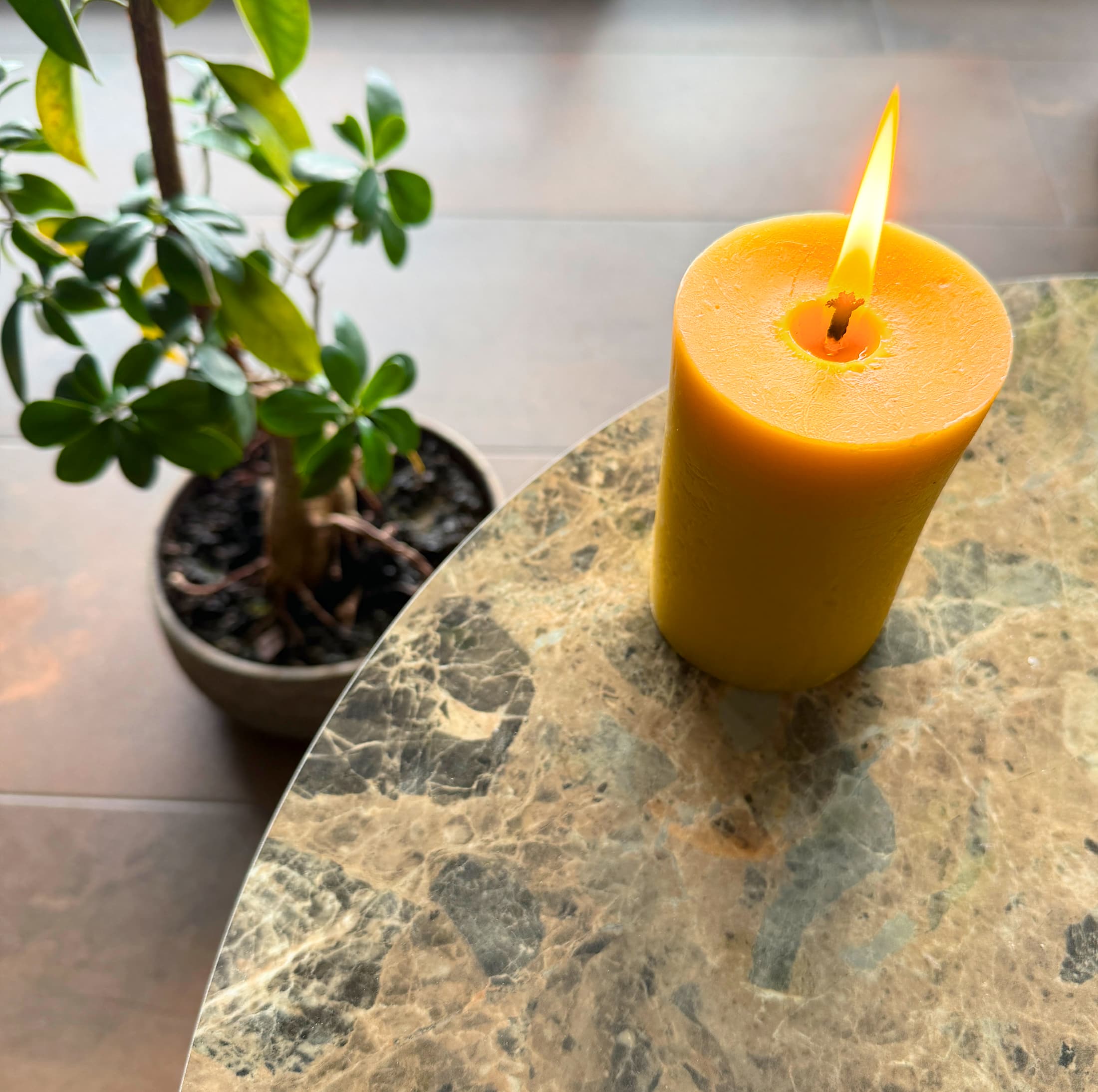 - Die Kerze hat eine warme, gelbe Farbe und verströmt einen angenehmen und dezenten Honigduft