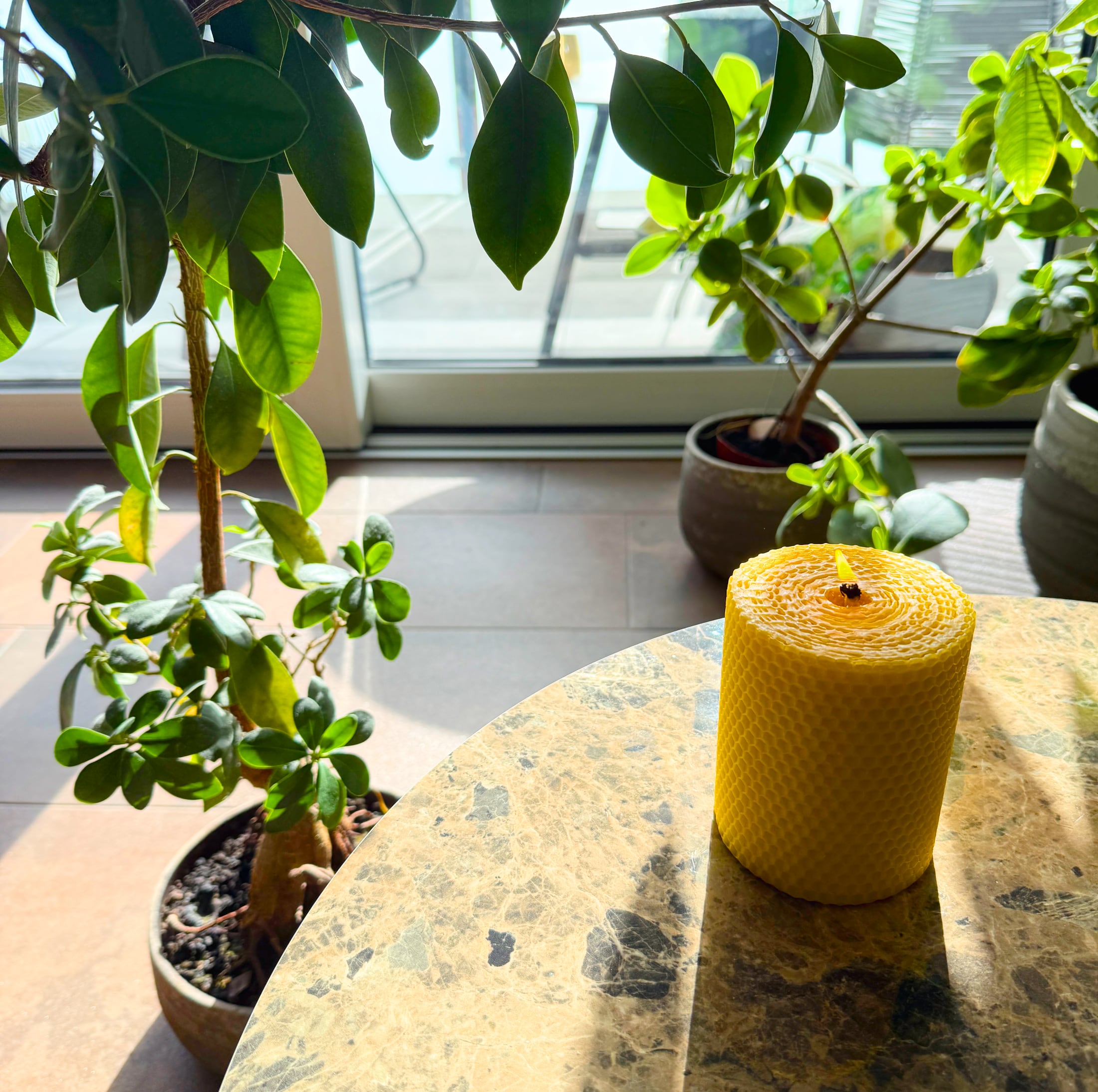 - Die Kerze hat eine warme, gelbe Farbe und verströmt einen angenehmen und dezenten Honigduft