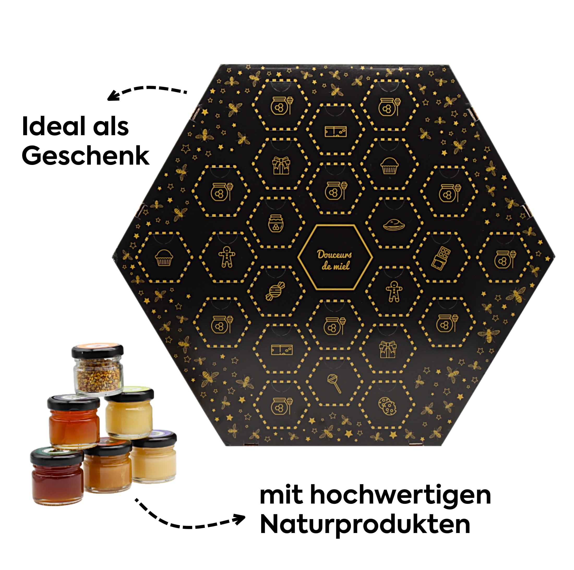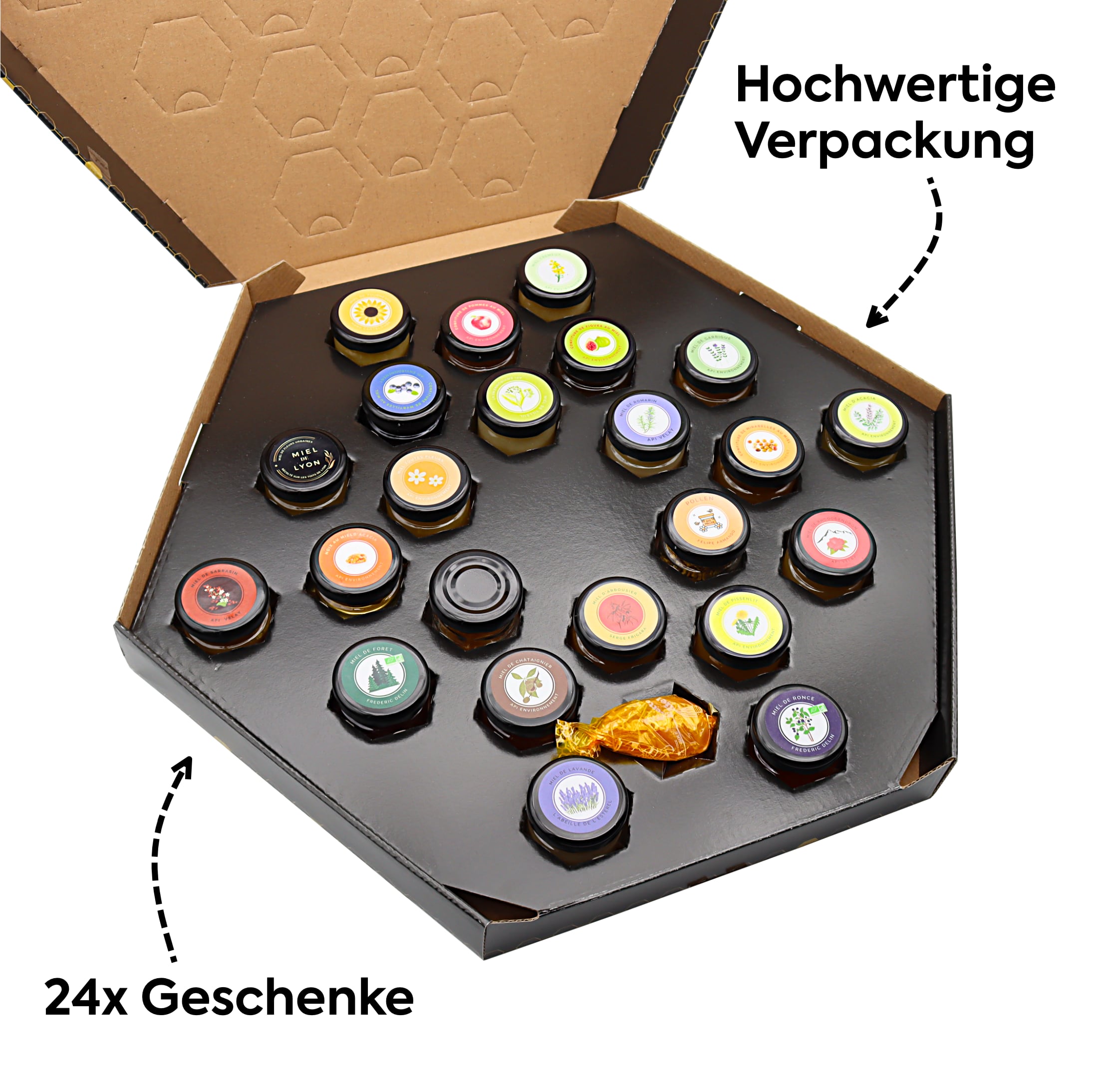 Verwöhnen Sie Ihre Liebsten mit 24 liebevoll gestalteten Honigüberraschungen in handlichen 40 g Gläsern, die das ganze Jahr über Freude und Genuss bringen. - Spannendes Öffnen mit persönlichen Symbolen