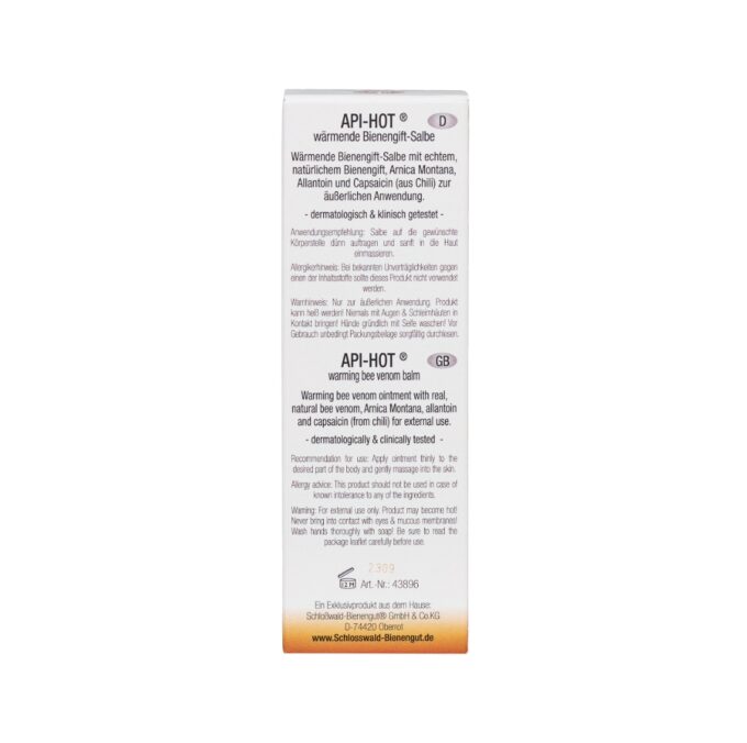 - Die API-HOT wärmende Bienengift-Salbe ist in einer praktischen 50 ml Tube und wird in einer Umverpackung geliefert
