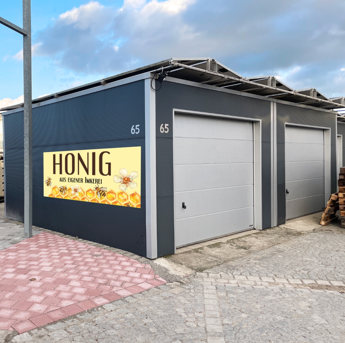 - Werbebanner Honig aus eigener Imkerei (Bienen + Blüten)